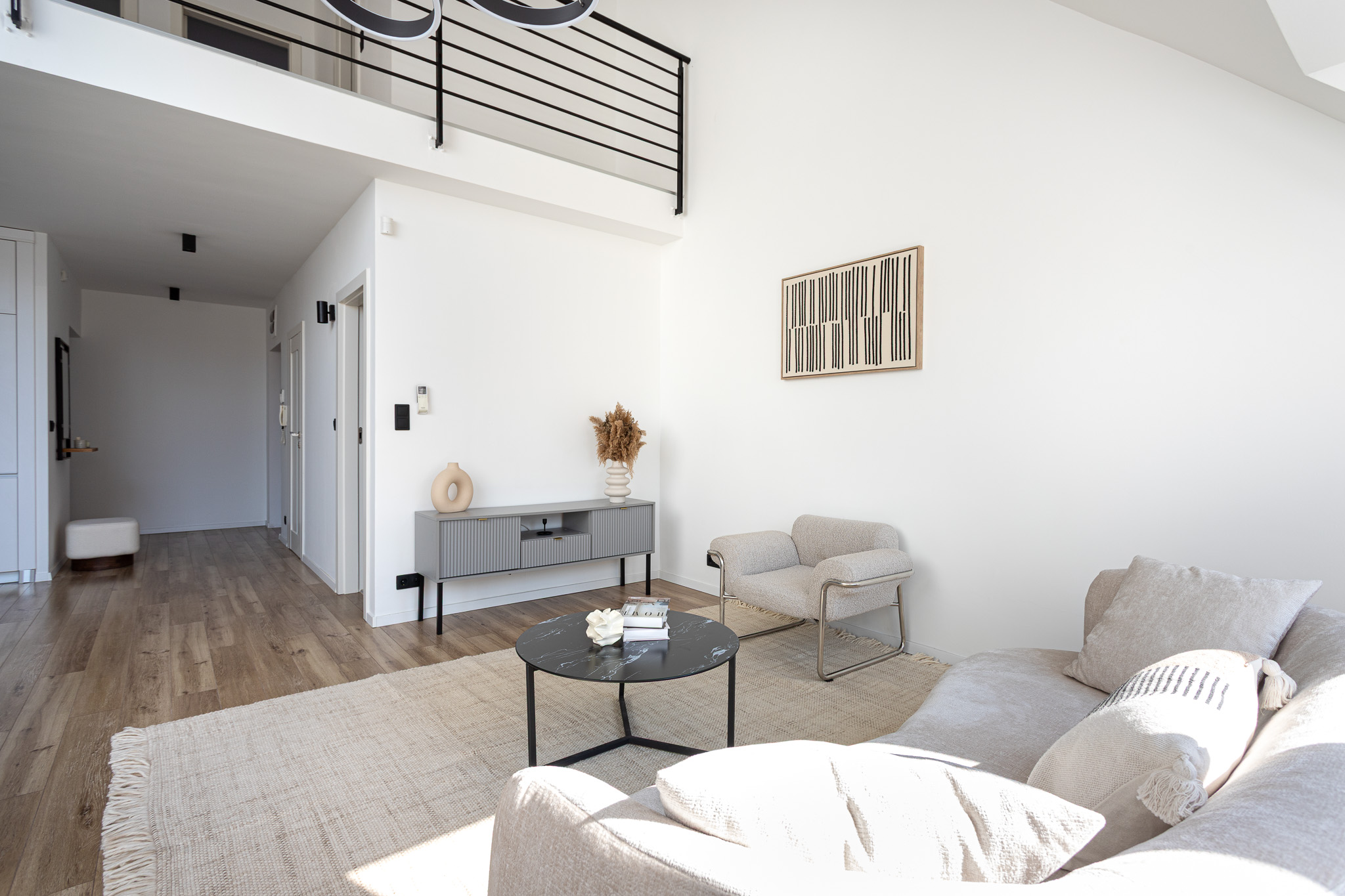 Az alsó szinten található egy fényárban úszó amerikai konyhás nappali hatalmas belmagassággal, egy hálószoba, egy zuhanyzós fürdőszoba és egy wc. A déli fekvésű nappaliból nyílik a 4 nm-es erkély.