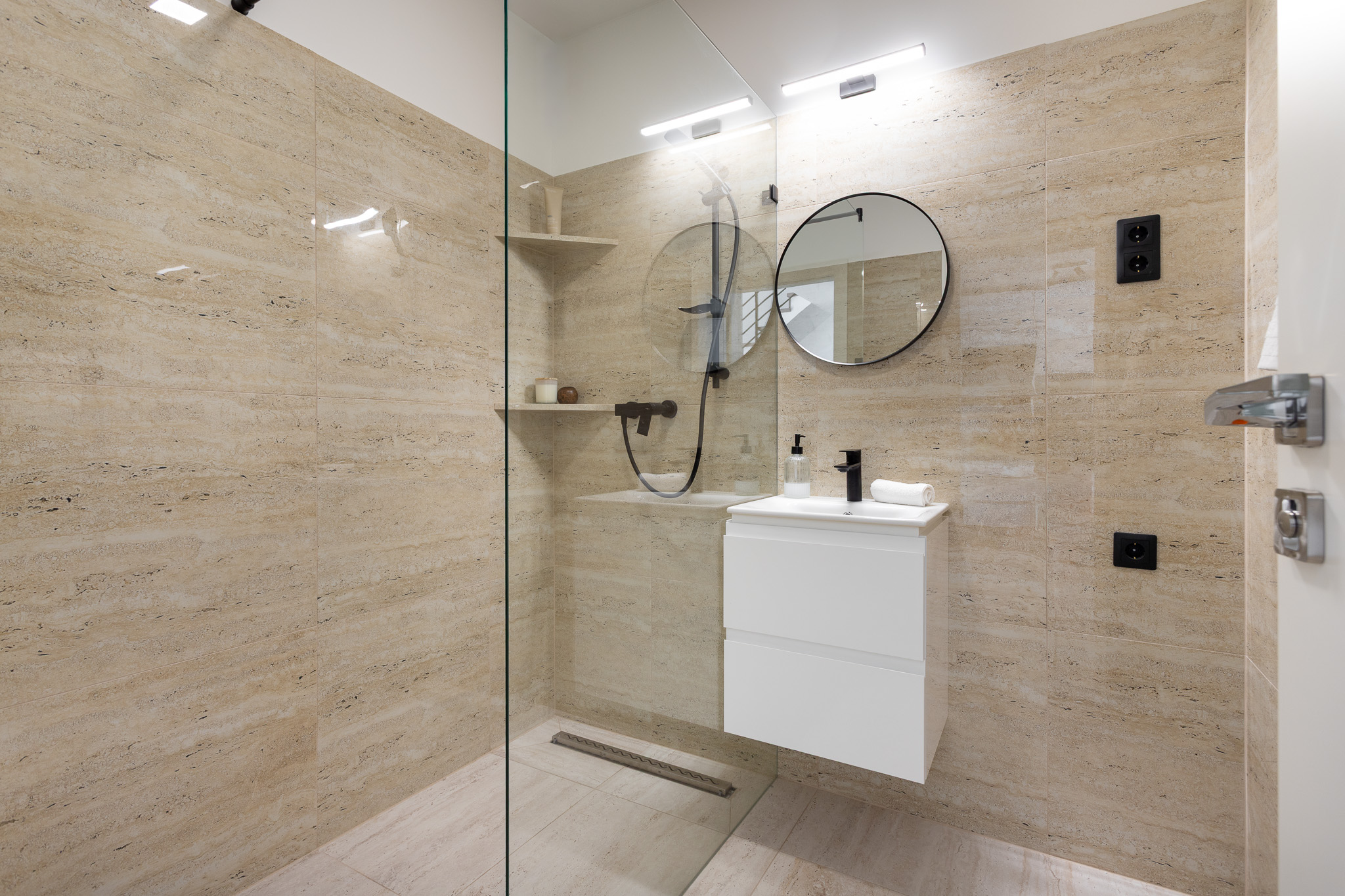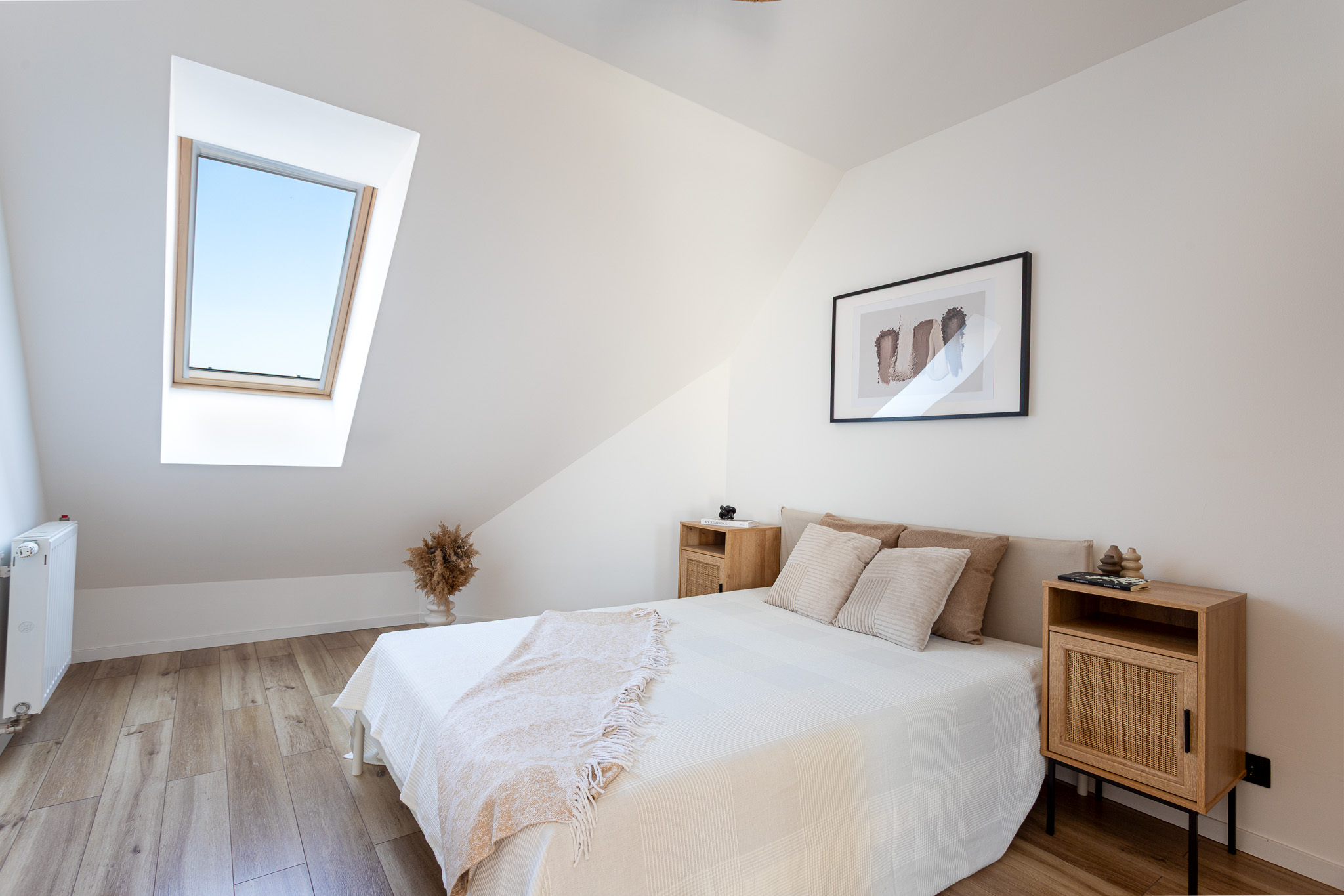 A nappaliban lévő hatalmas ablakokon az árnyékolást elektromos redőnyök biztosítják, a többi ablakon Velux tetőtéri árnyékolók találhatóak.