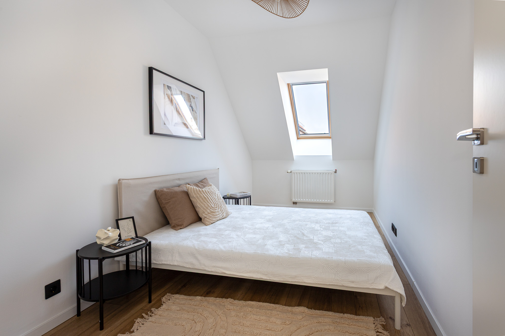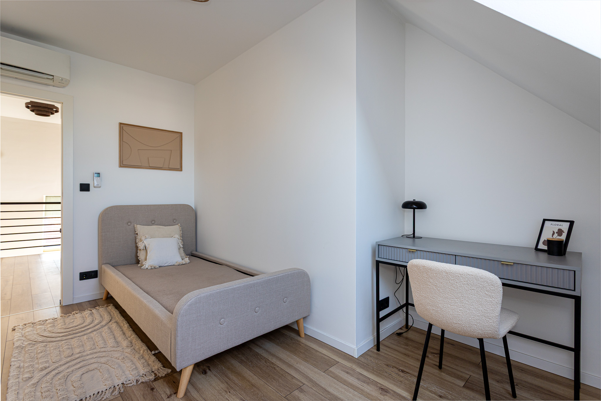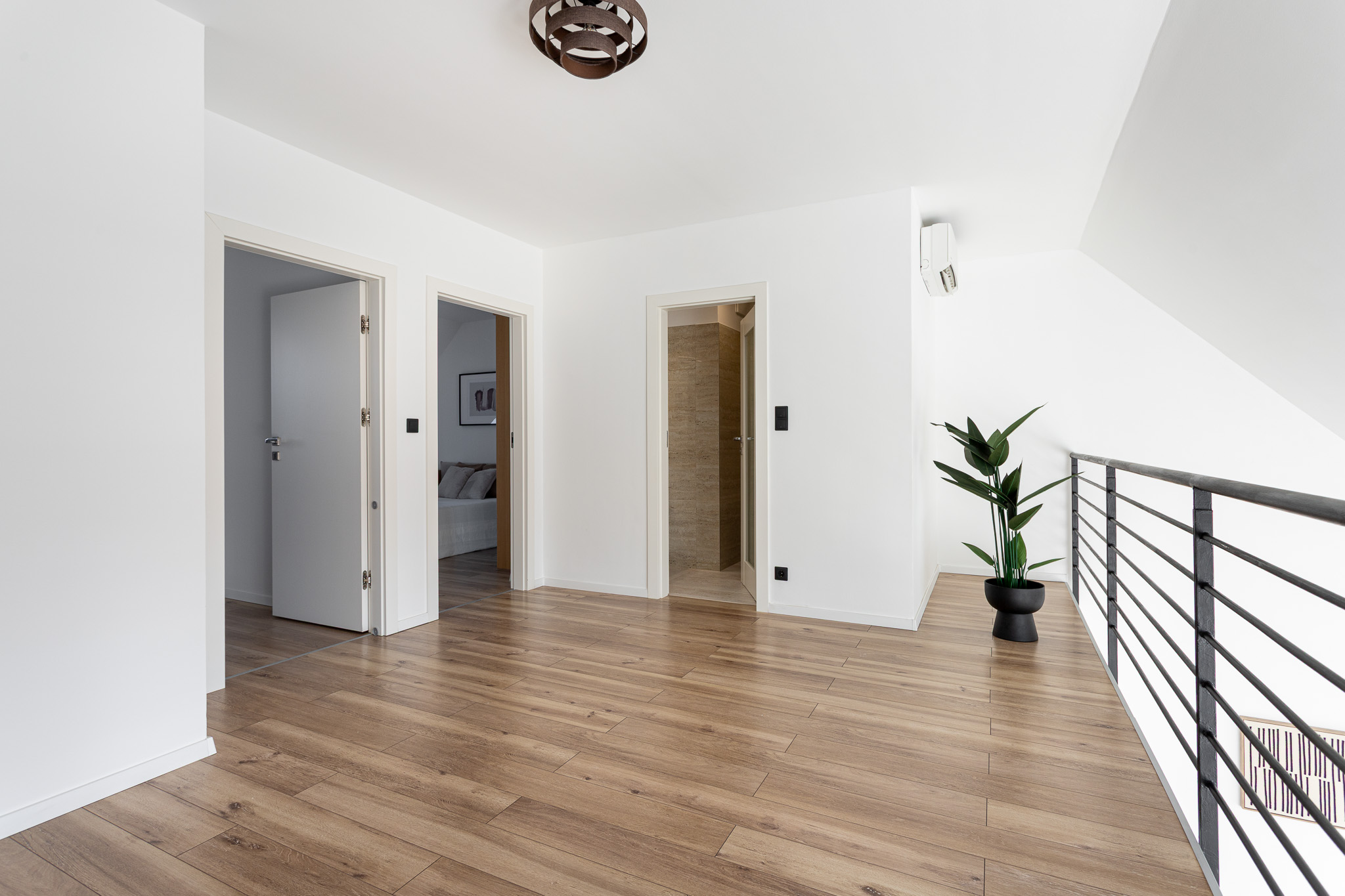 A nappaliból jutunk fel a felső szintre, ahol 2 hálószoba és egy kádas fürdőszoba (wc-vel) található. A fenti tágas, világos előtér home-office-ként is hasznosítható.